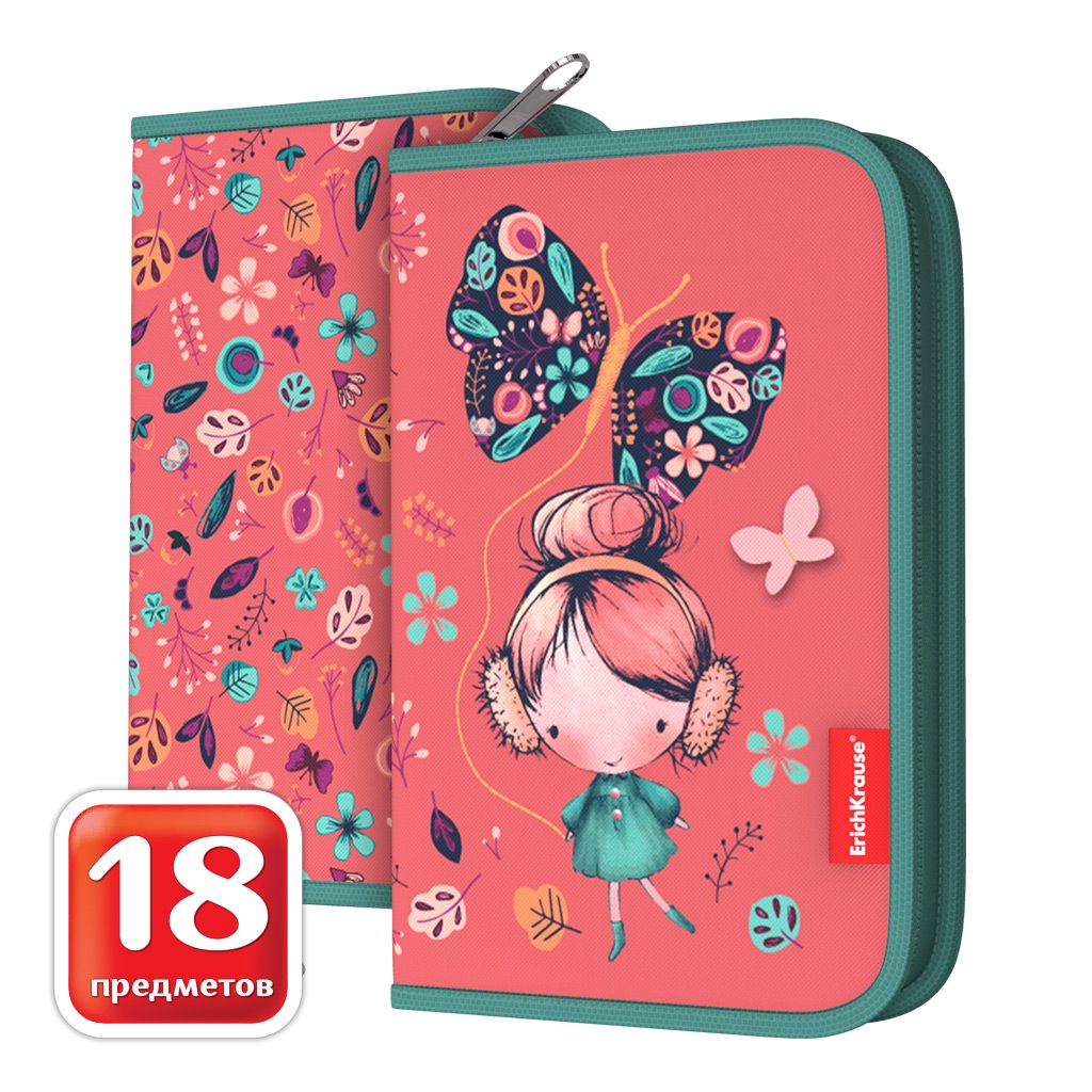 Классический жестко-каркасный пенал-книжка с внутренней системой фиксации школьных принадлежностей. Пенал изготовлен из износостойкого 100%-го полиэстера. Пеналы имеют расширенную молнию, что облегчает постоянное закрытие и открывание пенала. Надежная молния с мягким ходом оснащена удлиненным бегунком с логотипом ErichKrause®. Наполнение (18 предметов): ручка шариковая, синие чернила: 2 шт., чернографитный карандаш HB: 1 шт., фломастеры: 6 цветов, цветные карандаши: 6 цветов, ластик: 1 шт., точилка: 1 шт., линейка пластиковая 15 см: 1 шт.