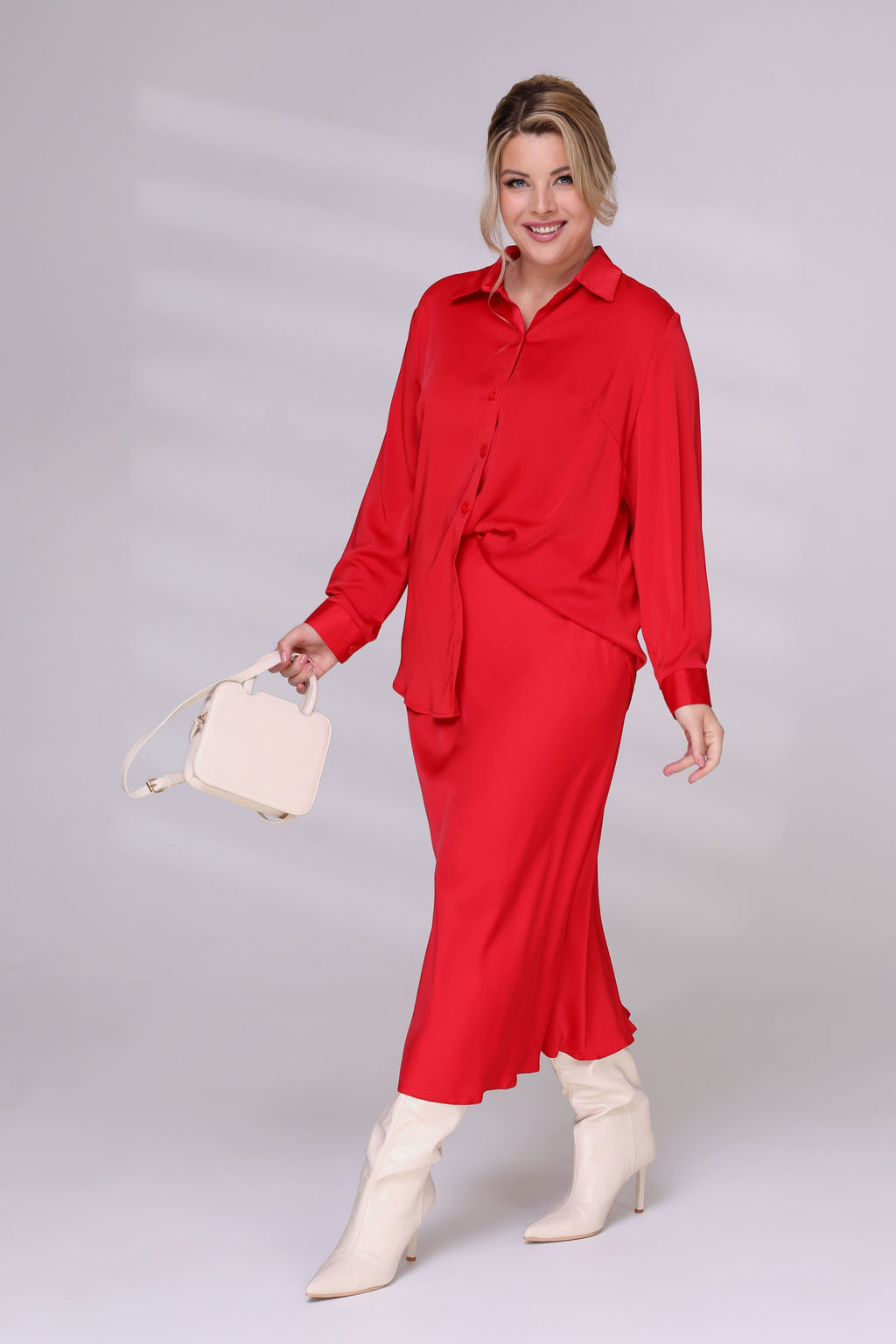 Стильный женский костюм из мягкого струящегося материала состоит из рубашки и юбки. Удлиненная рубашка свободного кроя имеет классический отложной воротник. Вытачки на груди и закругленные бока способствуют оптимальной посадке по фигуре. Модель застегивается спереди под планку на пуговицы по всей длине. Рукава полной длины с приспущенной проймой по низу оформлены манжетами с пуговками. Юбка прямого силуэта виртуозно обыгрывает фигуру благодаря оригинальному крою модели. Пояс на резинке способствует оптимальной посадке по фигуре. Женственный костюм идеально подойдет для торжественных мероприятий разного характера. Подчеркните лаконичность образа длинными серьгами и туфлями на высоких каблуках. Элементы костюма можно также носить по отдельности.