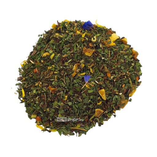 Состав: ройбос, мята, цедра апельсина, мелисса, кусочки яблока, липа, морковь сушеная, цветы незабудки, лепестки календулы.