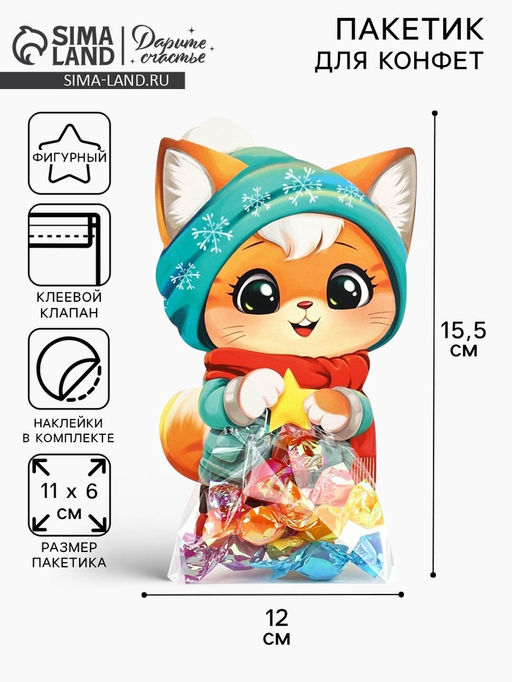 • Цена за 10 шт. Пакетик под сладости на Новый год «Зимний котик», 6×11 см