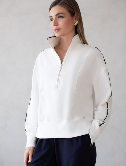 Джемпер с воротом на молнии выполнен из эластичного футера двухнитки. Модель умеренно свободного кроя. По рукавам и воротнику кант из футера контрасного цвета. Изделие дополнено золотистым логотипом бренда.