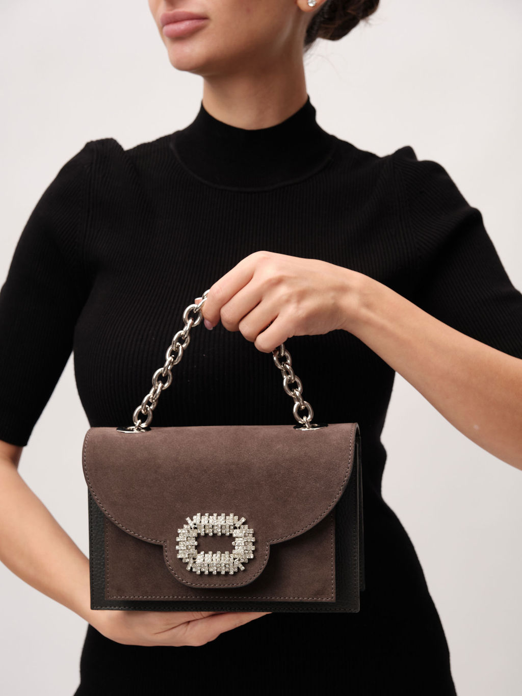 Детали: натуральная замша, натуральная кожа, несъемная ручка-цепочка, съемный регулируемый кожаный ремень, 1 накладной внешний карман под клапаном, клапан с внутренней отделкой из натуральной замши с застежкой, 1 внутренний закрытый карман на молнии, 1 внутреннее отделение, хлопковая водонепроницаемая подкладка, декоративная пряжка со стразами.­