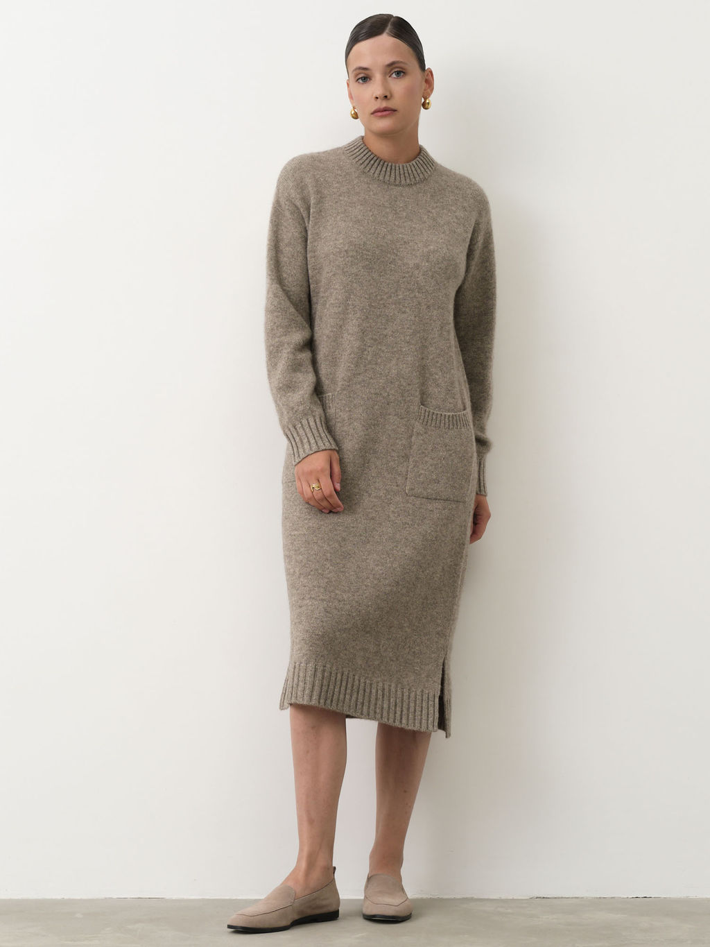 Модель прямого кроя с длинными рукавами и удобными карманами на передней части подчеркнет Вашу элегантность и чувство стиля. Нейтральный серый цвет легко сочетается с любыми аксессуарами и обувью, что делает это платье универсальным выбором для повседневной носки или деловых встреч.­