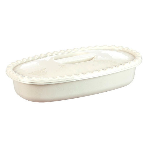 Невысокая продолговатая миска с крышкой. Подходит для приготовления и подачи еды, а благодаря плотной крышке ее можно использовать для хранения и переноски продуктов. Благодаря своей форме удобна для слоеных салатов, напримерМимоза илиСеледка под шубой.