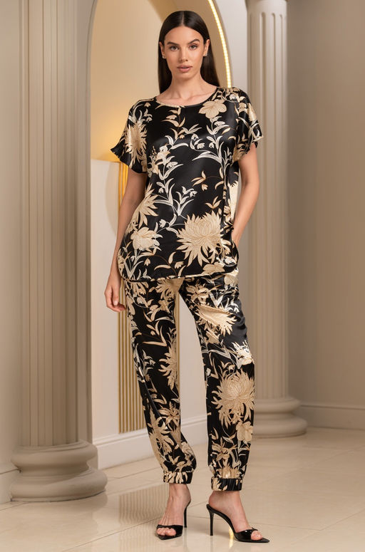 Комплект-двойка Mia-Amore состоит из топа со спущенными плечами и брюк с манжетами на резинке по низу, выполнен из принтованного смесового полотна. Брюки с поясом на резинке. В боковых швах брюк обработаны боковые карманы. Состав:70% натуральный шелк, 25% полиэстер, 5% эластан