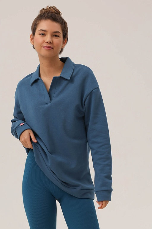 Женский свитшот поло с воротником свободного силуэта из премиального футера. Обьемный крой, удлиненный рукав, спущенное плечо и теплый материал подарят ощущение комфорта и уюта.­