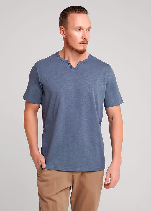 Футболка мужская с округлой горловиной и планкой из фактурного полотна флам. Данная модель прекрасно комбинируется с джинсами или шортами. Модель дополнена имиджевой фурнитурой. Отличное решение на лето для прогулок с друзьями или поездки на отдых. 100% хлопок