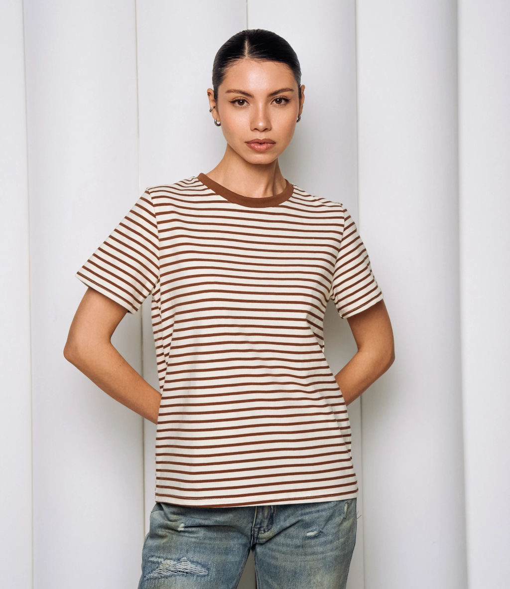 Эта футболка прекрасный выбор для вашего магазина, предлагая стильный и универсальный дизайн, который станет отличным дополнением к гардеробу ваших клиентов. Эта модель представлена в классическом полосатом узоре, сочетая нейтральные и приглушенные тона, что делает её универсальной. Футболка с традиционным круглым вырезом и короткими рукавами, свободного кроя, что обеспечивает свободу движений и комфорт. Идеально подходит для сочетания с джинсами, шортами или брюками, а также может быть использована как базовый элемент для создания многослойных образов. Выполненная из ткани с 95% хлопка и 5% полиэстер, футболка обеспечивает отличное качество и приятные тактильные ощущения. Независимо от сезона, она станет любимым элементом в гардеробе ваших клиентов. На странице сайта доступна таблица размеров, что позволит вашим покупателям легко найти подходящий вариант. Установленная цена делает эту футболку доступной для широкой аудитории, что обеспечит вам высокий уровень продаж. Рост модели: 164, параметры: 83-61-89. -- Характеристики -- Цвет: коричневый Пол: Женский Страна производитель: Китай Сезон: Всесезонный Материал: Хлопок, Полиэстер