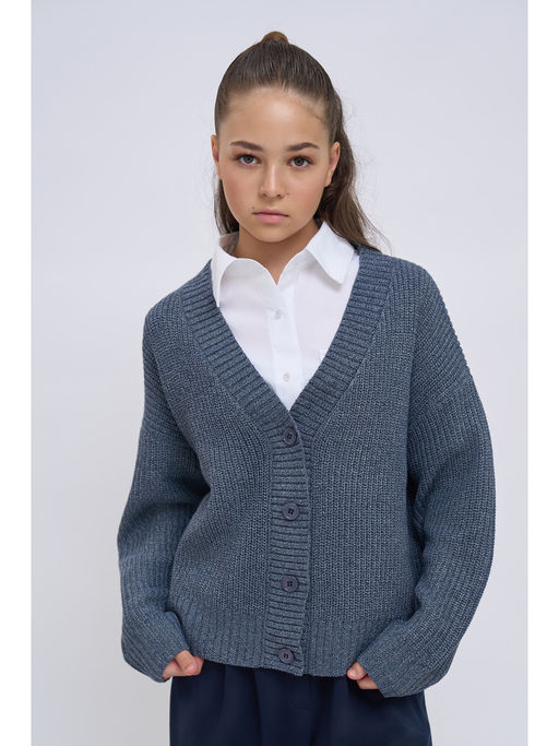 Кардиган для девочки оверсайз. Крупная вязка, 5 калибр. Нить - цветной меланж приглушенного оттенка. Пуговицы диаметром 2см. По нижнему краю и манжетам вязка "резинка" 2*2, высотой 6см. По планке полочки вязка "резинка" 2*2, высотой 4см. Состав:50% хлопок, 10% вискоза, 20% полиэстер, 20% полиамид