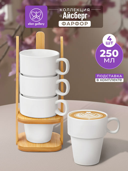 Набор 4 кружек из серии Айсберг от Elan Gallery предназначен для эстетичной сервировки вашего стола. Размер каждой ёмкости 11х8,5х24,5 см, объём 250 мл. Выполнены из высококачественного белого фарфора. Он не впитывает цвет напитков и легко отмывается, благодаря чему надолго сохраняет свою белизну. Поставляются в комплекте с подставкой из натурального бамбука. Её размер 10х10х23,5 см. Декоративные кофейные кружечки помогут провести множество приятных завтраков с капучино и латте, а также уютные чайные вечера с конфетами, вафлями, другими десертами и сладостями. Подойдут ценителям чая и кофе, которые любят пить из красивой и необычной посуды. Согрейтесь зимой любимым напитком: какао с маршмэллоу, ягодным чаем и горячим шоколадом. Летом освежитесь домашним лимонадом или морсом. Чашки помогут организовать запоминающееся чаепитие в большой компании. Благодаря бамбуковой подставке и штабелируемому формату кружечек вы сможете компактно хранить комплект. Не рекомендуется применять абразивные моющие средства. Без бамбуковой подставки кружки подходят для использования в посудомоечной машине и микроволновой печи. Бамбук нельзя замачивать! Поставляются в дизайнерской картонной коробке благодаря ей вам не потребуется дополнительная подарочная упаковка. Фарфоровая сервировочная посуда будет оригинальным подарком для хозяйки, ценящей не только практичность, но и привлекательность. Серия Айсберг от бренда Элан Галерея станет украшением любого кухонного инвентаря и позволит собрать красивый сервиз в едином стиле!