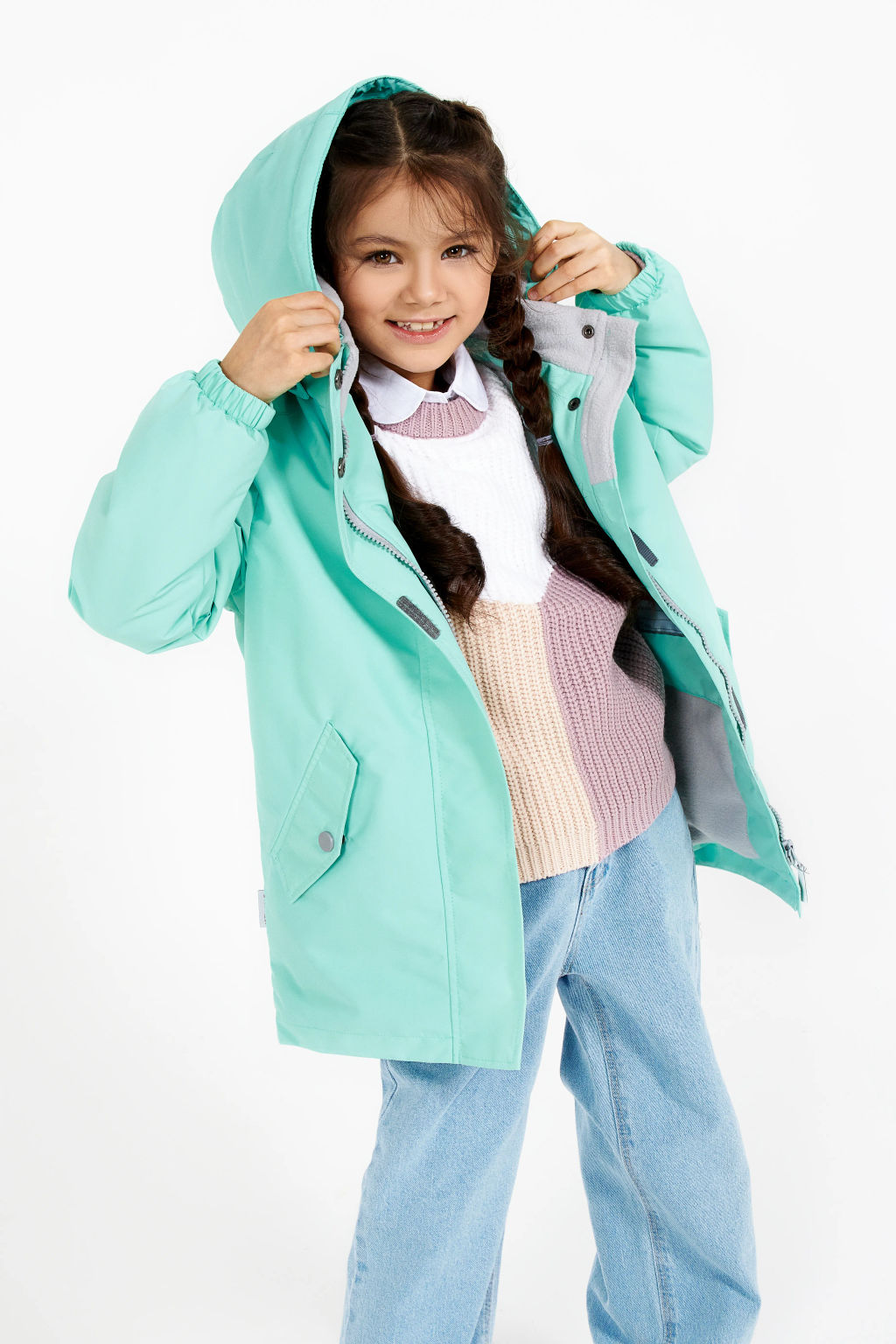 Куртка для девочек дошкольного возраста из мембранной ткани. Центральная молния закрыта планкой на липучках и кнопках. Комбинированная подкладка из цветного флиса и шелка с внутренним карманом на липучке. Съёмный капюшон с подкладкой из цветного флиса. 2 передних кармана с клапаном на кнопке. На куртке расположены светоотражающие элементы. Рассчитана на температуру от 0 до +10.­