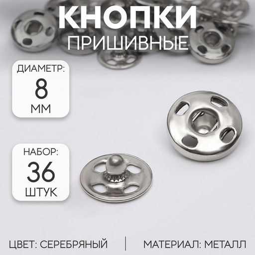 Пришивные кнопки подойдут для создания невидимого крепления. Они применяются в качестве потайных застёжек на изделиях из деликатной ткани. Вы можете использовать их для пошива детской и кукольной одежды, трикотажных изделий или постельного белья.Кнопки прочно фиксируются в закрытом виде, пришиваются к изделиям обычными нитками и не повреждают материал. Кнопки прослужат вам долго и не выйдут из строя даже после многократного использования.В наборе 36 штук, d = 8 мм, цвет серебряный. Набор: Да. Диаметр, мм: 8. В наборе, шт.: 36. Вид: Пришивные. Бесплатная доставка: Да. Размеры товара: 8.3/0.5/13.