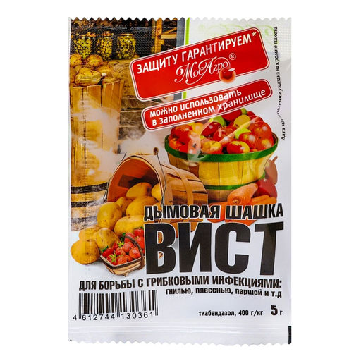 Системный Фунгицид, обладает защитными и лечащими свойствами. Для борьбы с грибковыми инфекциями (плесенью, паршой, гнилями), при хранения плодоовощной продукции, а также профилактической обработке помещений (погребов, подвалов, теплиц, оранжерей, транспортных средств, зернохранилищ и др.), Одна шашка рассчитана на 25 куб.м пустых хранилищ или на 500 кг картофеля, овощей.Период защитного действия: 6-8 месяца.Применяют препарат ВИСТ в любой период хранения с/х продукции. Лучшие результаты достигаются при обработке сразу после закладки продукции на хранение (до 7 дней).Клубни картофеля обрабатываются дважды - перед посадкой и при закладке на хранение.Действующее вещество: тиабендозол, 400 г/кг.Способ применения: Перед началом обработки загерметизировать помещение (закрыть вентиляционные отверстия). Извлечь шашку из упаковки, открыть крышку, поставить на негорючую основу и поджечь.Внимание! Шашка должна дымить! После начала дымления покиньте помещение, плотно закрыв двери. Время экспозиции препарата - 24 час. Работы в помещения производить не ранее чем через трое суток после обработки.Шашка Вист весом всего 5 грамм по эффективности равна 5 стограммовым серным шашкам. Область применения: Для дезинфекции. Область применения: От бактериальных и грибных болезней. Область применения: От грибковых заболеваний. Назначение: Универсальное. Форма выпуска: Сухое. Препаративная форма: Порошок. Вид: БИОпрепараты. Вес/Объём: 5 г. Бесплатная доставка: Да.
