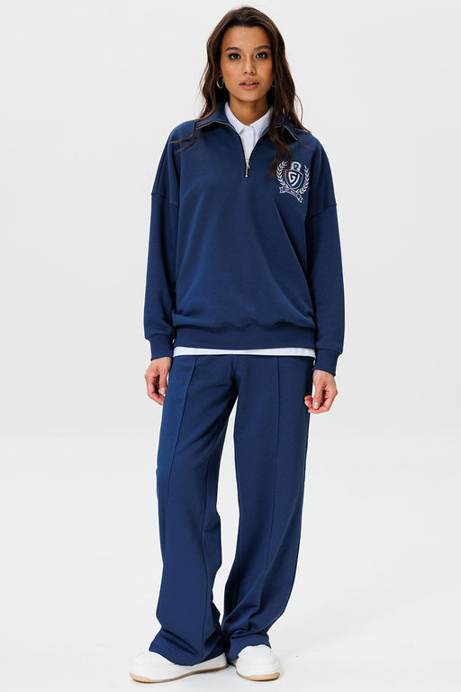 Состав: ПЭ-20%; Хлопок-80%; Женский яркий, повседневный костюм, состоящий из оверсайз свитшота с контрастной вышивкой и брюк со стрелками. Это находка для тех, кто ценит свободу, стиль и не хочет отказывать себе в комфорте 24/7. Свитшот: * дизайнерская вышивка * свободный силуэт * короткая застежка - молния * манжеты рукавов, стойка и низ свитшота из ткани кашкорсе Брюки: * прямой силуэт * удобные карманы * стрелки по переду зафиксированы строчкой * пояс из ткани кашкорсе с резинкой и шнуром Длина свитшота по спинке 64-67 см. Длина рукава свитшота с плечом: 69-71 см для роста 164-170 см, 72-74 см для роста 170-176 см. Полуобхват груди свитшота: 42 р - 64 см, 44 р - 66 см, 46 р - 68 см, 48 р - 70 см, 50 р - 72 см, 52 р - 74 см. Длина брюк по боковому шву с поясом: 102-104 см для роста 164-170 см, 105-107 см для роста 170-176 см. Полуобхват бедер брюк: 42 р - 48 см, 44 р - 50 см, 46 р. - 52 см, 48 р. - 54 см, 50 р. - 56 см, 52 р. - 58 см. -- Характеристики -- Состав: ПЭ-20%; Хлопок-80%; Сезон: Лето Рост: 164 Страна бренда: Беларусь