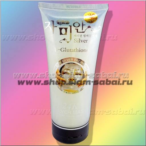 Серебряная маска - пленка для лица плюс глутатион L-Glutathione 24k Silver Mask 220 ml Маска для лица на основе коллоидного серебра, обогащенная антиоксидантом Л - Глутатионом, гиалуроновой кислотой, витаминным комплексом и коллагеном Южнокорейского производства. Серебряная маска пленка за счет активного мощного антивозрастного состава обладает выраженным омолаживающим кожу свойством, возвращает коже эластичность, гладкость, подтягивает овал лица. В отличие от золотой маски этой же серии, серебряная маска хорошо сужает поры, и особенно подойдет для ухода за проблемной зрелой кожей. Серебряная маска накладывается на чистую кожу лица в виде серебристой пастообразной массы, которая спустя 15-20 минут застывает, подсыхает и становится похожей на фольгу на коже, и затем удаляется как пленка с лица. Как любая маска-пленка для лица, серебряная омолаживающая маска с глутатионом обладает и хорошими очищающими и сужающими поры кожи свойствами, удаляет мёртвые клетки, действуя как мягкий пилинг. Объем маски с коллоидным серебром и глутатионом 220 мл. Способ применения серебряной маски пленки с глутатионом: Небольшое количество маски выдавить на ладонь и нанести на кожу лица, избегая области глаз, бровей и губ. Через 15-20 минут маска высохнет и ее можно снять с лица как пленку. При необходимости смыть оставшиеся кусочки маски водой