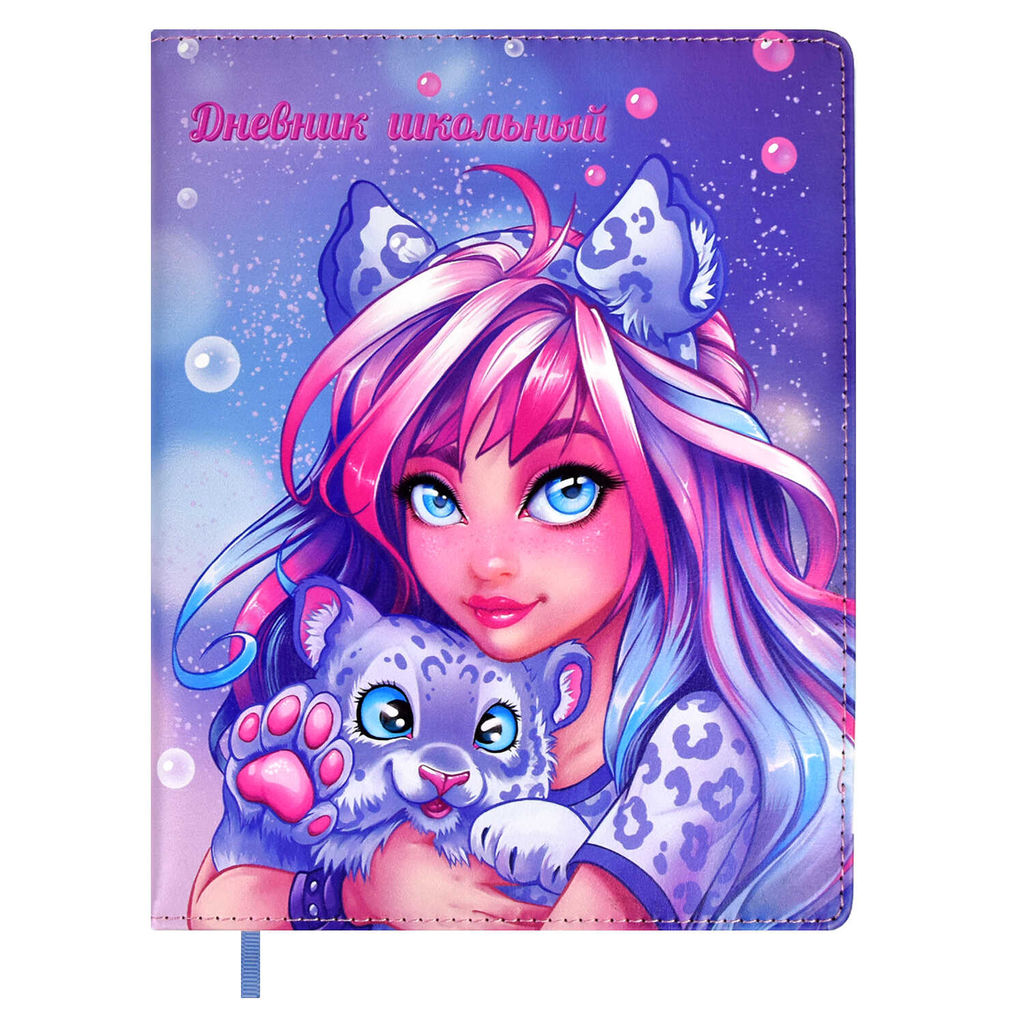 Дневник школьный арт. 62138 / 15 ДЕВУШКА С БАРСОМ (кожзам: А5+; твёрдый переплёт с поролоном, материал обложки: искусственная кожа "Наппа"; декор: полноцветная печать; способ крепления блока: ниткошвейный; вн. блок: 48 л., белый офсет 80 г/м?, печать в одну краску, справочный материал: есть; закладка: одно ляссе; форзац: печать в одну краску; индивидуальная упаковка: ПЭТ-пакет)