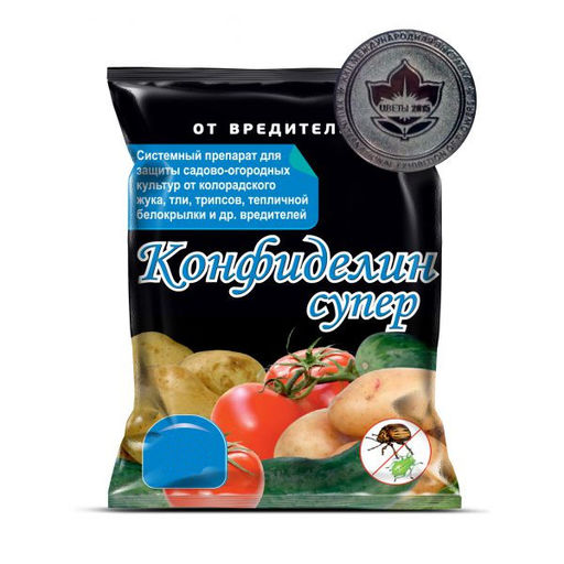 Быстродействующий препарат, уничтожает самых стойких вредителей - колорадского жука на картофеле, белокрылку, тлей, трипсов на овощных, цветочных и декоративных культурах. Характеристики: * назначение: колорадский жук, тля, белокрылка; * объем: 3г; * препаративная форма: вододиспергируемые гранулы; * упаковка: пакет; * действующее вещество: имидаклоприд 700 г/кг; * срок годности: см. на упаковке. Особенности и преимущества: * Защищает растения длительный период времени 20 суток. * Не разлагается под действием высокой температуры и прямых солнечных лучей. * Устойчив к воздействию влажного воздуха, что позволяет использовать его в теплицах. * Медленно смывается дождем. * Не является фитотоксичным и не наносит вреда растениям. * При соблюдении дозировки мало опасен для людей, теплокровных животных, рептилий и обитателей водоемов (3 класс опасности). * Уничтожает несколько видов вредителей. * Эффект появляется через несколько часов после распыления рабочего раствора. * Привыкание к препарату маловероятно. Меры предосторожности: Использование индивидуальных средств защиты как при обработке растений, так и при приготовлении раствора. При обработке убедиться в отсутствии рядом детей и домашних животных. Применение: * Для разных культур готовят рабочие жидкости с различной концентрацией препарата. * Обработка ведется в любое время вегетационного периода, по мере появления вредителей. * Обработка картофеля против колорадского жука: необходимо развести 0,3 грамма (1 мл) препарата в 5 литрах воды. 25 литров готового раствора достаточно для обработки 1 гектара огорода. * Обработка тепличных помидор и огурцов против трипсов, тли, белокрылки: 1,5 грамма (5 мл) Конфиделина разводят в 10 литрах воды. Этого объема достаточно для опрыскивания 100 квадратных метров теплицы.