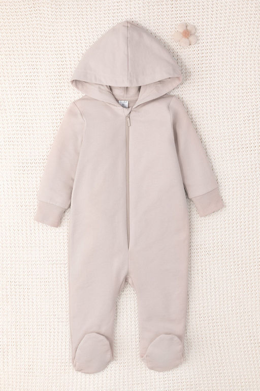 Тёплый комбинезон из футера с начёсом для новорождённых. Застёгивается на молнию. Капюшон с подкладом из интерлока. Эластичные манжеты из рибаны. В размерах 80-92 без ножек с манжетами. Все трикотажные полотна производятся в соответствии с нормами Швейцарского сертификата ЭкоТекс.­