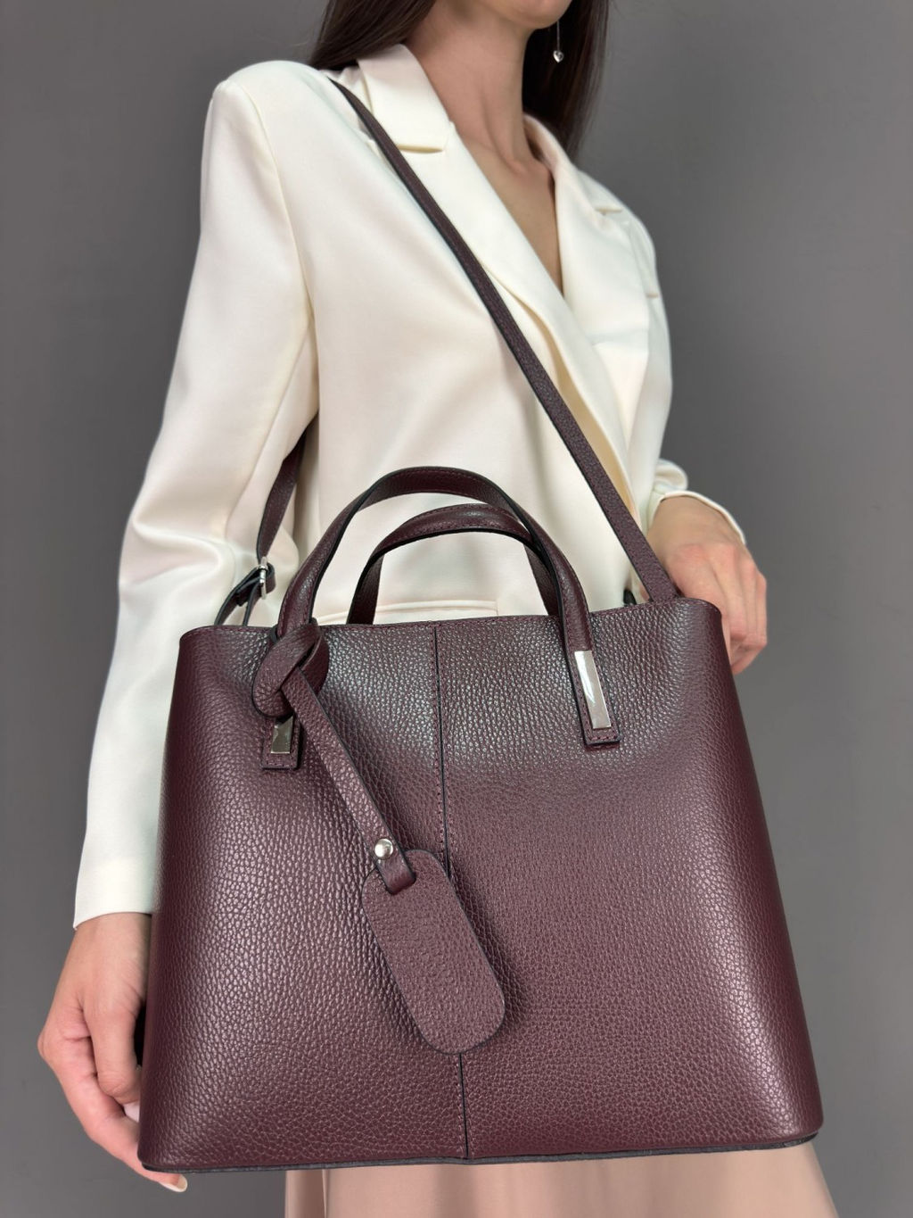 Страна: Италия Акции: Товары со скидкой Производитель: Pelletteria Luisa, Italy Размер: средняя Стиль ношения: короткие ручки в руках Форма: жесткая Выделка кожи: зернистая износостойкая Цвет кожи: Бордовый Оттенок: бордовый винный Упаковка: Пакет тканевый L, 40x40 см Палитра цветов: TB-806 Dollaro Размеры: длина: 33 см \tвысота: 26 см \tширина: 15 см \tвысота ручек: 12 см Описание: Компактная и стильная сумка из натуральной телячьей кожи, производство Италия. Выполнена из очень прочной и влагостойкой кожи, не страшны ни царапины, ни перепады температуры.Закрывается на молнию сверху. Внутри: 2 больших отделения, между ними перегородка с большим карманом на молнии. На боковых стенках - 1 карман на молнии и 2 кармана для мелких предметов. Дополнительно имеется ремешок для ношения сумки на плече, длина 120 см. Эта сумочка представляет собой актуальную реплику D-bag, одной из излюбленных сумок принцессы Дианы, которую та носила с собой, что называется, и в пир и в мир. Любимица публики, принцесса сердец" ценила статусные аксессуары, а ее взыскательный выбор неизменно поднимал престиж модных Домов. Словом, есть чему следовать, есть чему поучиться! В представленной модели присутствует и свой акцент в виде модного ныне крупного декоративного брелока. Следует отметить и совершенно роскошный цветовой ряд, в котором выполнена коллекция: есть и классические цвета, и наиболее трендовые оттенки последних сезонов. Если ваша цель - выглядеть элегантно и при этом непринужденно как на светском рауте, так и при походе в спортзал, имеет смысл выбрать эту по-королевски эталонную модель! "