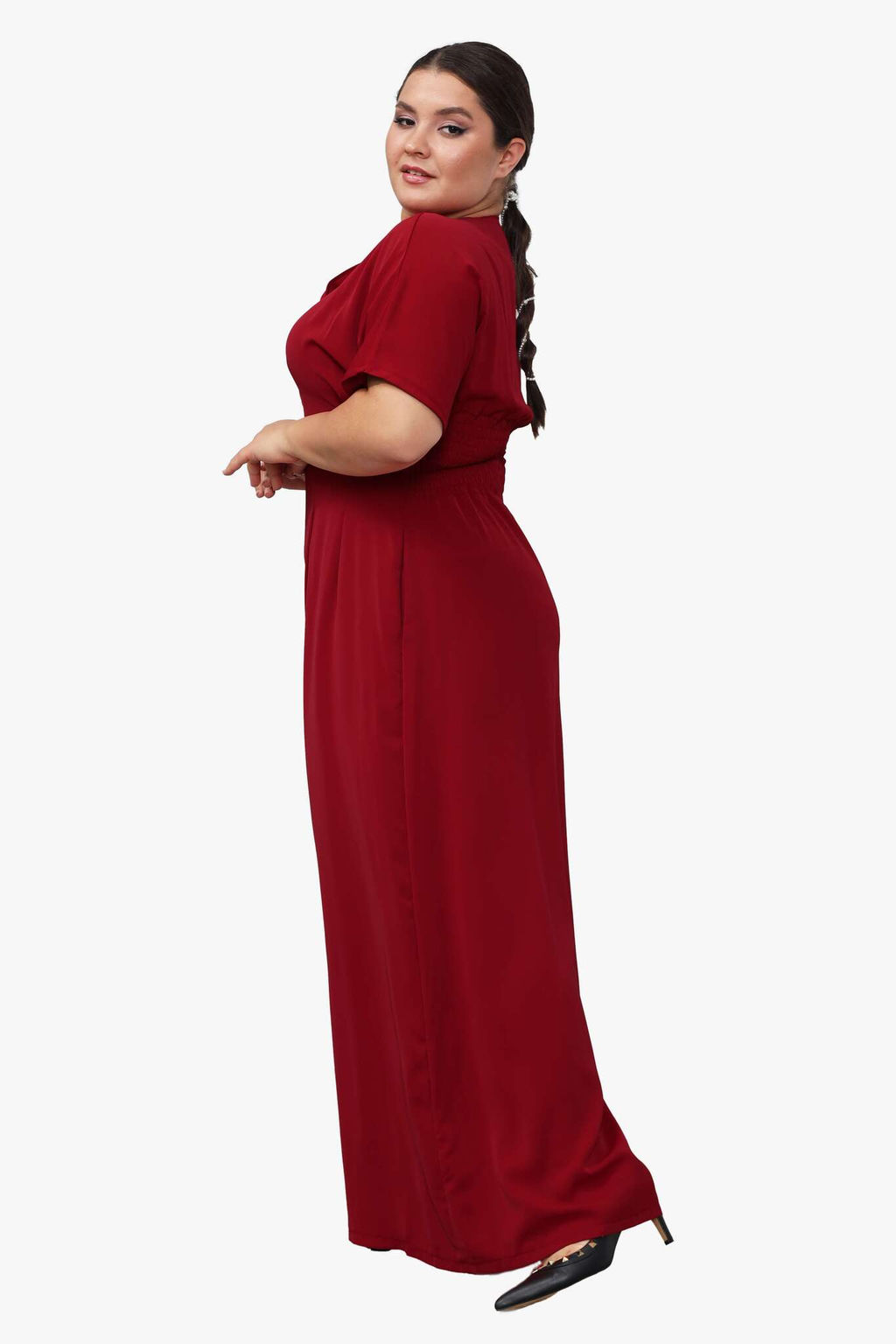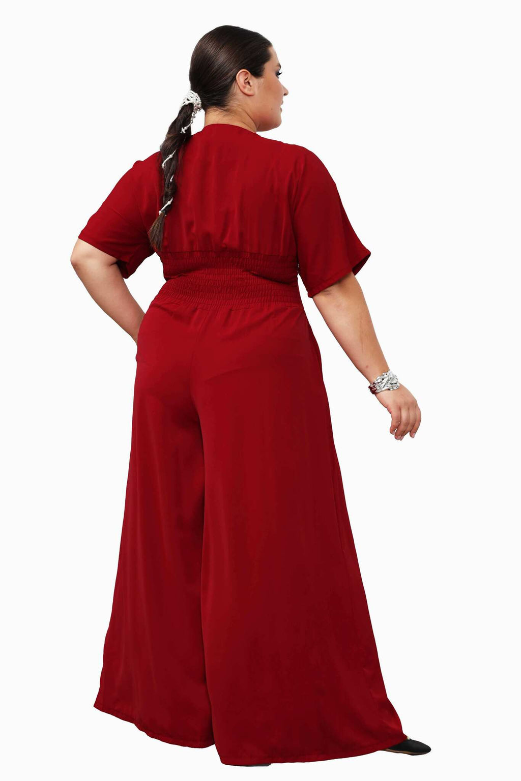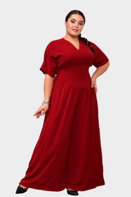 Эффектный комбинезон из мягкого материала имеет цельнокроеные  короткие рукава. V-образный вырез на груди переходит в короткую молнию. Широкая резинка - венгерка и вытачки по талии способствует оптимальной посадке по фигуре. По бокам  практичные вшивные карманы. Модель привлекает внимание широким клёшем. Гламурный, лёгкий, выгодно подчеркивающий фигуру комбинезон сделает Вас заметной и выделит из толпы.
