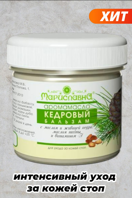 Аромамасло «Кедровый бальзам» Мариславна — крем-масло для интенсивного ухода за кожей стоп. Содержит масла бабассу и ши, инфузы зверобоя крапивы и коры дуба, пчелиный воск, кедровую живицу, витамины A и E и эфирные масла пихты кедра апельсина и пачули. Композиция питает и смягчает сухую грубую кожу, способствует регенерации и обладает антисептическим и дезодорирующим действием. Рекомендуется применять 1–2 раза в день, в том числе на ночь, наносить после душа или ванны.