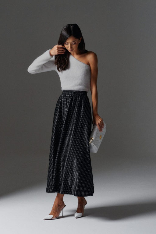 Джемпер прилегающего силуэта с открытым плечом выполнен из мягкого фактурного полотна серого цвета.