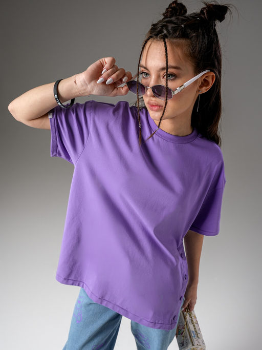 Футболка для девочки Оверсайз свободногосилуэта, из премиального качественного хлопкового пенье кулирной глади с лайкрой. В левом боковом шве шлица на кнопках. Принт на спинке. Состав:92% хлопок, 8% лайкра