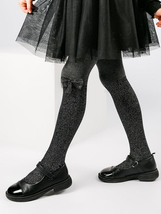 Однотонные, тёплые колготки из хлопка, с люрексом. Мягкий, натуральный материал позволяет коже дышать, обладает гипоаллергенными свойствами. Эластичные, комфортные колготки не скатываются, с одним швом. Колготки украшены бантиком из фатиновой ленты и люрекса.