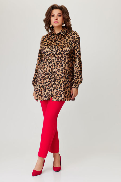 Блузка женская прямого силуэта, с втачным  рукавом. Линия плеча слегка спущена. Застежка центральная на 8 петель и пуговиц. По горловине отложной воротник  на стойке. Спинка с кокеткой и встречной складки из-под кокетки. Рукав длинный со сборкой по низу, на манжете с застежкой на петлю и пуговицу. В боковых швах обработаны разрезы.