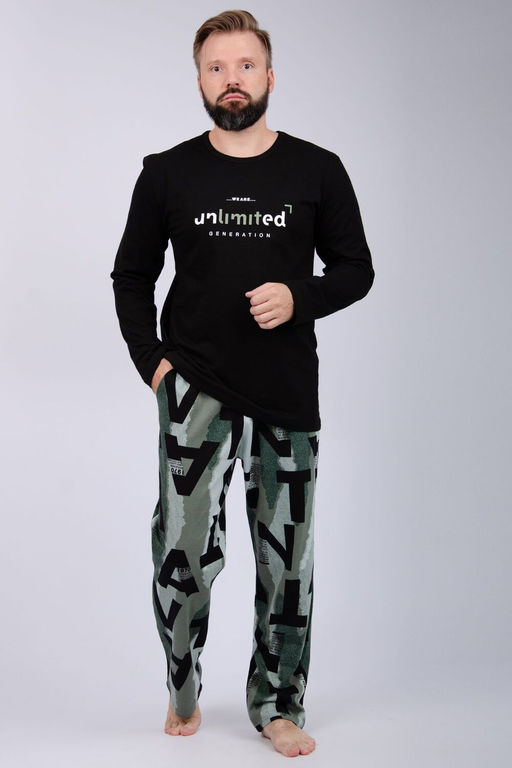Пижама мужская: футболка прямого кроя с короткими рукавами с принтом на полочке, брюки прямые, с карманами в боковых швах.