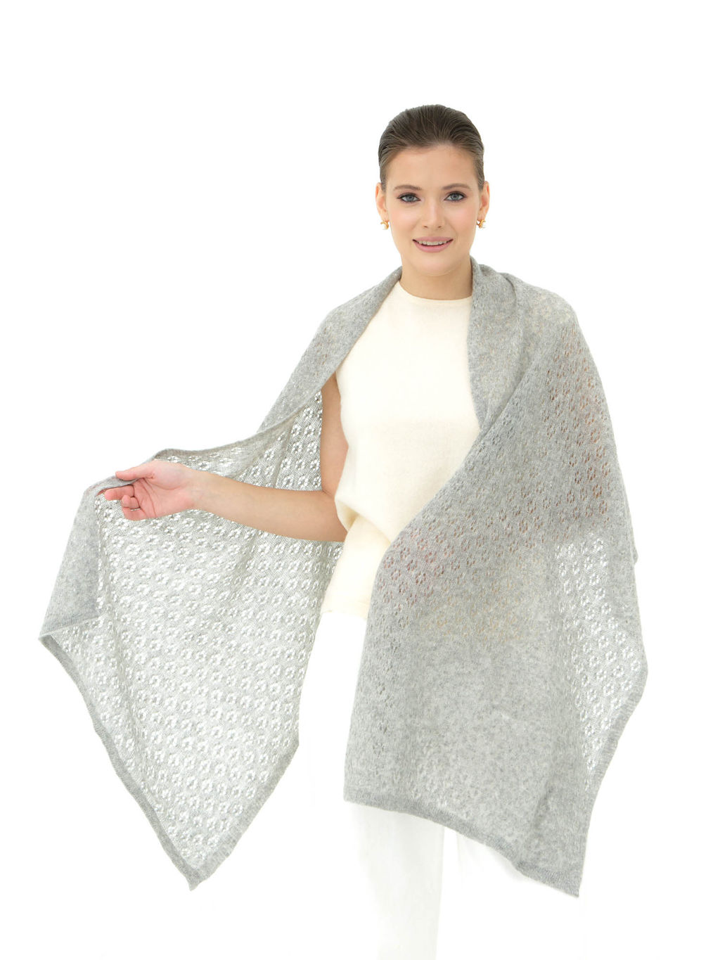 Элегантный серый палантин из 100% шерсти идеальный аксессуар для холодного времени года. Ажурный узор придает изделию лёгкость и изящество, добавляя нотку изысканности в любой наряд. Мягкая и тёплая шерсть обеспечивает комфорт и уют даже в самые прохладные дни.
