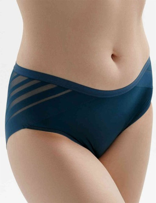 Трусы слипы женские от белорусского бренда Milavitsa модель 265350 в модной расцветке синий топаз, со средней линией талии. Выполнены из гладкого эластичного полотна с микрофиброй в сочетании с эластичной сеткой с узором.