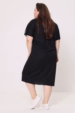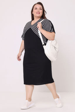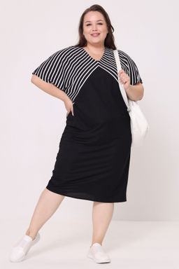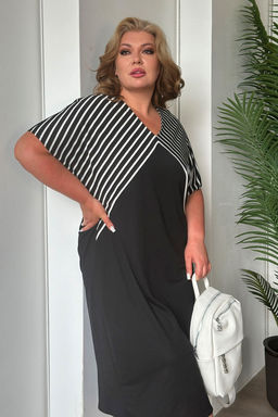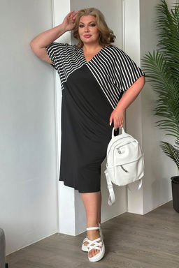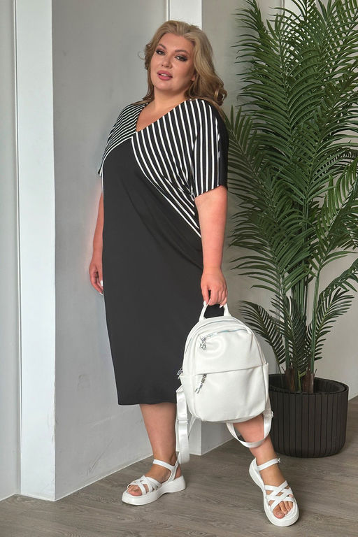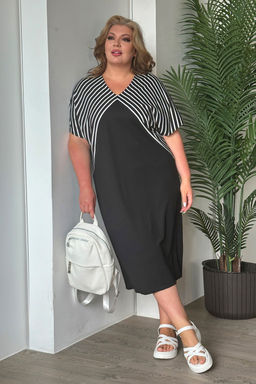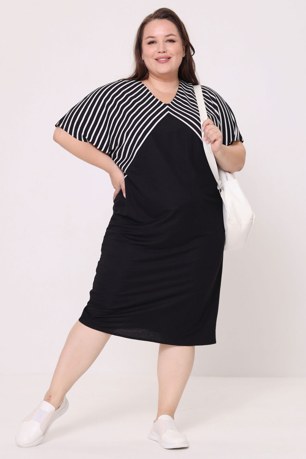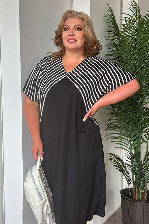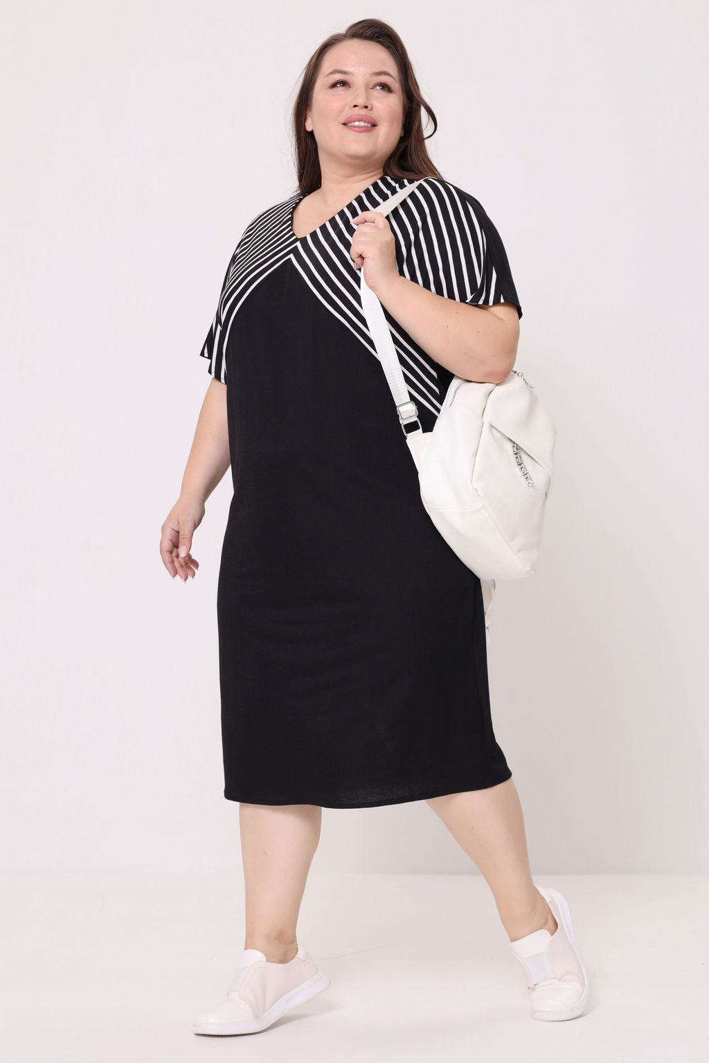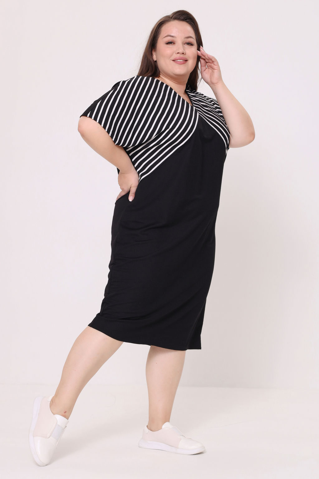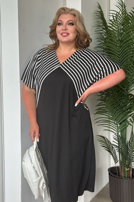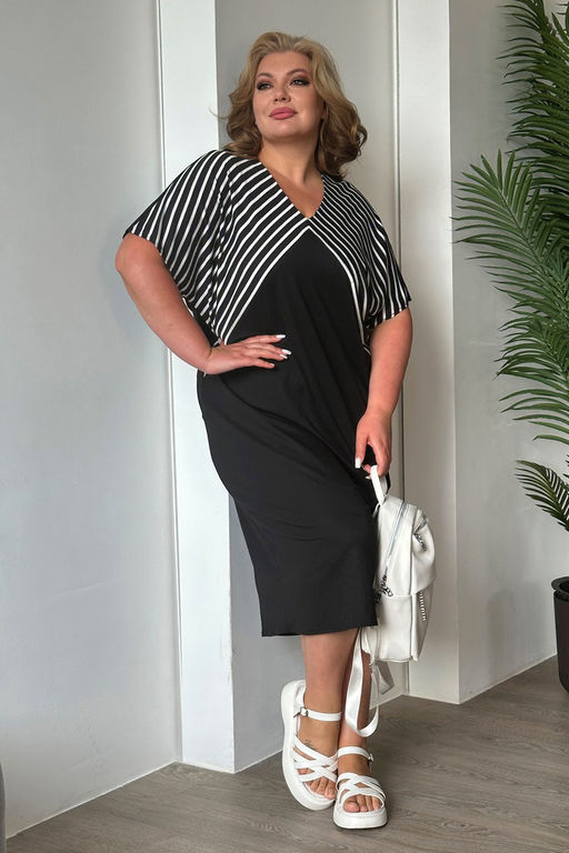 Элегантное платье из мягкого материала.  Модель имеет V-образный вырез и короткие цельнокроеные рукава. Диагональная вставка с полосатым принтом освежает образ и зрительно вытягивает силуэт.  Полуприлегающий силуэт красиво обыгрывает фигуру и не сковывает движений. Приятный телу материал дарит комфорт в течение всего дня. Стильный клатч и туфли на каблуках станут идеальным дополнением к образу.