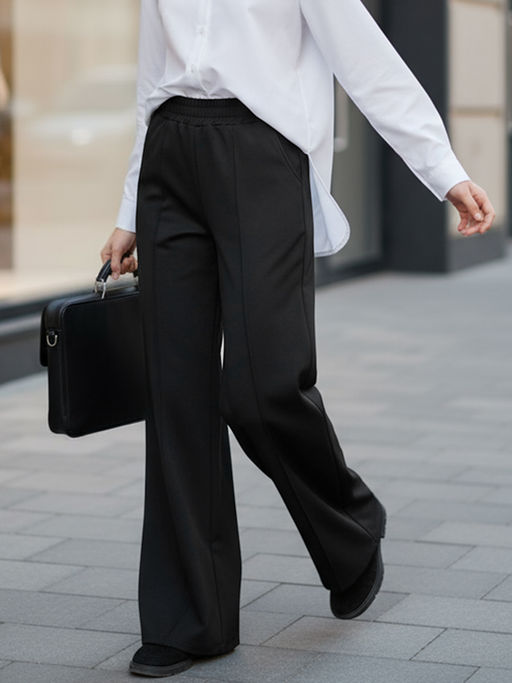 Стильные, трикотажные брюки палаццо на широкой резинке, без молнии и пуговиц. Модель имеет расширяющийся от бедра силуэт, что визуально вытягивает фигуру. Брюки прекрасно сочетаются с любым верхом, и подойдут для любого мероприятия, подчеркнут индивидуальный стиль девочки, и разнообразят ее повседневный школьный образ.