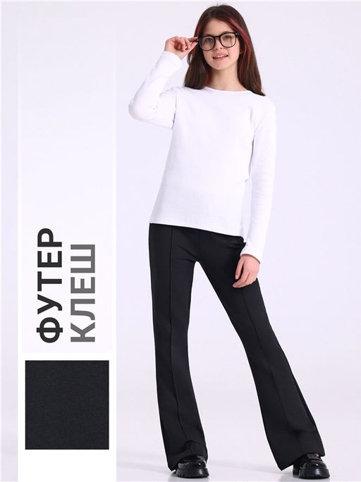 Уценка брюки,хлопок 95% + лайкра 5%,футер / хлопок 95% + лайкра 5%,черный / - / - / - / - / -,Школьные брюки-клеш для девочки выполнены из футера - мягкого плотного хлопкового полотна с лайкрой. Изделие со средней высотой посадки, без карманов, декорировано острочками-стрелками. Уход: только машинная стирка (руками не стирать!) при температуре 40 градусов, без предварительного замачивания. Ассортимент осенне-зимнего периода.