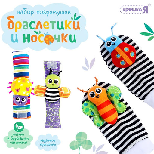 Набор погремушек для малышей — это текстильные аксессуары, которые помогут превратить первые месяцы жизни ребёнка в увлекательное исследование мира. В комплект входят четыре изделия: два носочка и два браслетика, которые легко крепятся на ручки и ножки малыша. Такие игрушки стимулируют развитие слуха, зрения и мелкой моторики с самого рождения.Особенности набораМягкий текстиль, приятный на ощупь, подходит для чувствительной кожи новорождённого.Звуковые элементы привлекают внимание и способствуют развитию слухового восприятия.Яркие цвета и контрастные узоры помогают тренировать зрение.Подходит для малышей от 0 месяцев — безопасный выбор для самых маленьких.Развиваемся играяБраслеты и носочки с встроенными погремушками идеально подходят для первых игр. Малыш двигает ножками и ручками, слышит приятные звуки и учится связывать движение с результатом. Это способствует раннему развитию координации движений и тактильного восприятия.Идеальный подарокЭтот комплект станет отличным подарком на рождение малыша, выписку из роддома или первые месяцы жизни. Практичный и оригинальный набор порадует и ребёнка, и родителей. Набор: Да. Для кого: Унисекс. Возраст: От 0 месяцев. Бесплатная доставка: Да.