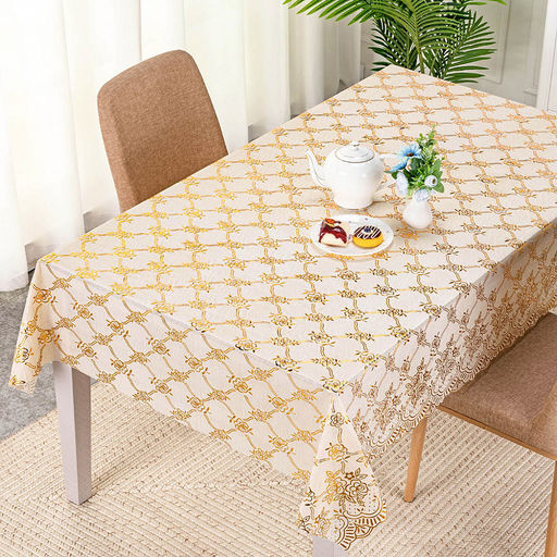 "LACE" Скатерть ажурная ПВХ "Нежность" 220х137см, длина стола до 180см, на 8 персон, белый фон, с золотом, матовая, на пленке, т.м. Домашняя мода (Китай)