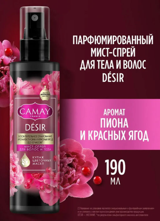 Спрей мист для тела парфюмированный Camay DSIR Восхитительное очарование это уходовый продукт-новинка с ароматом пиона и красных ягод. Спрей для волос парфюмированный женский Camay имеет в своем составе купаж цветочных масел. Спрей-мист для волос парфюмированный содержит эфирные масла лаванды, иланг-иланга и душицы.