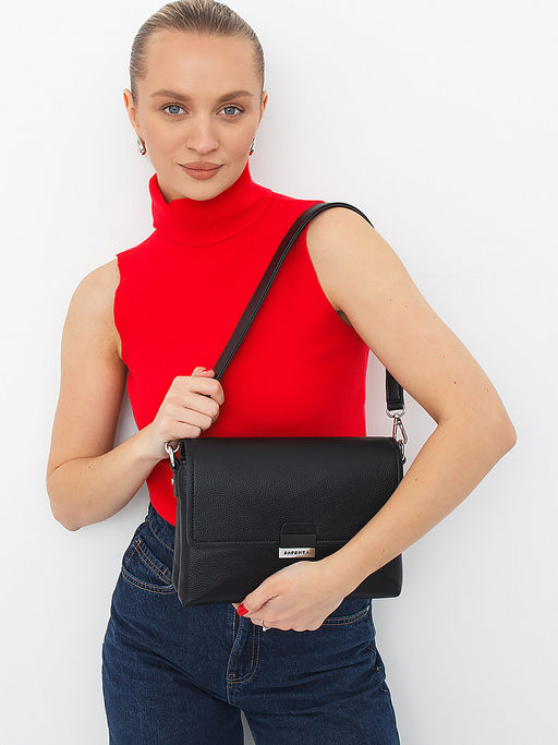 Базовая модель, выполнена из экокожи. Дополнена серебристой фурнитурой.  Данная модель закрывается на клапан. Носится в руке за съёмную ручку или на плече, съемный ремень регулируется по длине. Каркас полужесткий.