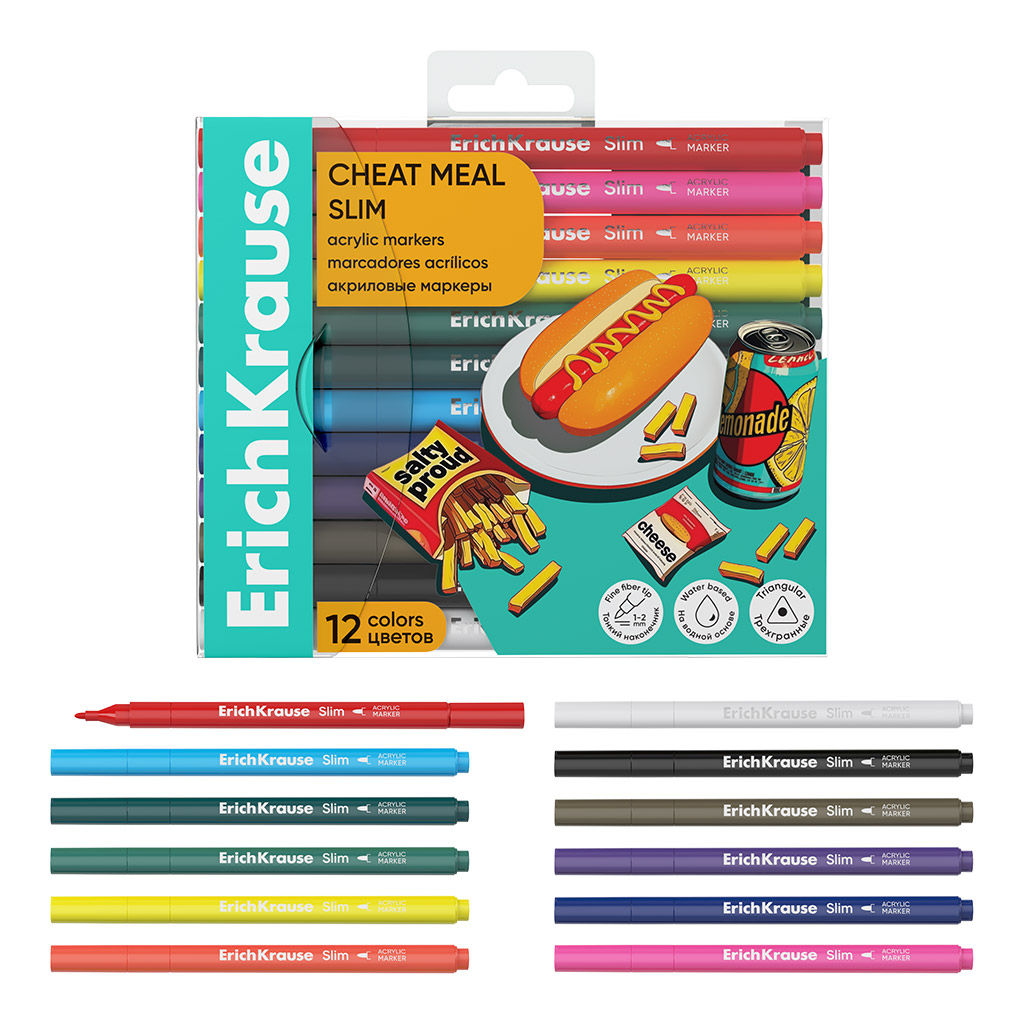 АКЦИЯ Цена за 24 шт. Цветные маркеры акриловые ErichKrause Slim Cheat Meal с пулевидным наконечником 12 цветов (в ПЭТ-боксе 12 шт)