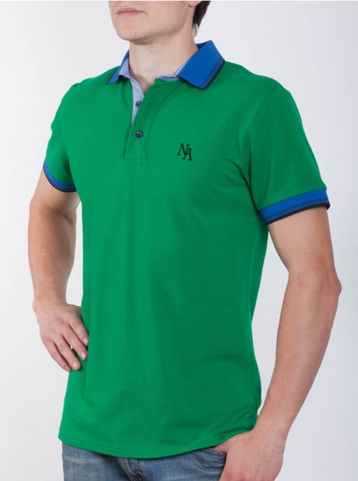Поло мужское зеленое с синим воротником с черными полосами по краю. Воротник и манжет выполнены из рибаны для большей устойчивости к истиранию. Отделка планки выполнена из декоративной ткани. Без вышивки на груди. Можно носить с джисами и неклассическими брюками.
