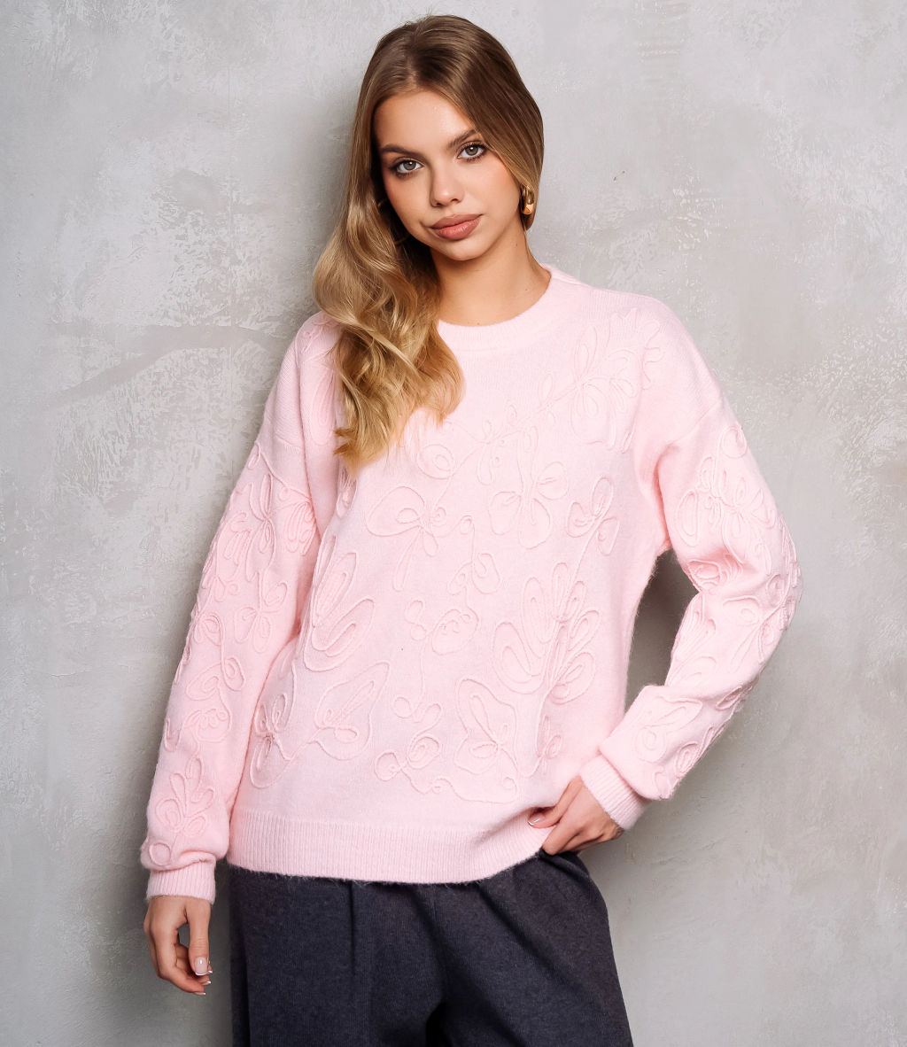 Джемпер это универсальная часть гардероба, которая выделяет женственность и придает образу аккуратность и стиль. Джемпер выполнен из плотного трикотажного полотна средней фактуры с выраженной объемной вышивкой, создающей рельефный флористический узор по всей поверхности. Модель прямого, слегка расслабленного кроя с мягко опущенной линией плеч, обеспечивающей свободную посадку в области рукавов. Горловина выполнена в виде кругового невысокого выреза с плотной резинкой, аккуратно прилегающей к шее. Рукава длинные, немного расширенные к низу, с широкими манжетами в рубчик, которые придают завершенность силуэту и предотвращают растягивание. Низ изделия оформлен широкой резинкой в рубчик. Для пошива использована ткань: 55% акрил, 45% хлопок. Материал отличается приятной на ощупь структурой, эластичностью и хорошей износостойкостью; даже после многократных стирок изделие не утратит первоначального вида и посадки. Обратите внимание на насыщенные оттенки: цвет соответствует фотографии на сайте, что важно при формировании товарной витрины. На странице представлена таблица размеров, с помощью которой можно самостоятельно снять мерки и подобрать нужный размер. Мы предлагаем выгодные оптовые условия, гибкую ценовую политику и стабильные поставки, что позволит вам формировать привлекательную наценку и обеспечивать высокую оборотность. Цена установлена адекватная, а качество стабильное: предложите своим клиенткам джемпер, сочетающий комфорт, стиль и надежность. Рост модели 168 см., 89-63-90. -- Характеристики -- Цвет: розовый Пол: Женский Страна производитель: Китай Сезон: Демисезон Материал: Бархат, Акрил