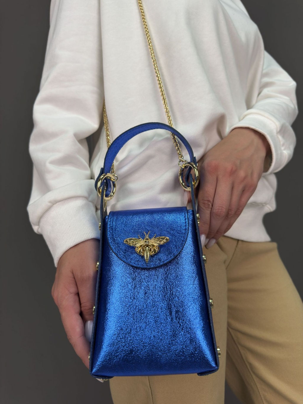Страна: Италия Акции: Товары со скидкой Производитель: Pelletteria Luisa, Italy Размер: маленькая Стиль ношения: на ремешке через плечо Форма: жесткая Выделка кожи: зернистая износостойкая Цвет кожи: Синий Оттенок: ярко-синий металлик Упаковка: Пакет тканевый L, 40x40 см Палитра цветов: TB-105944 Dollaro Размеры: длина: 13 см \tвысота: 21 см \tширина: 6 см Описание: Красивая аккуратная необыкновенно модная женская сумка кросс-боди из натуральной кожи. коллекция Весна-Лето Sefaro, Италия. Особенности сумки: замок в виде золотой бабочки, плечевой ремень-цепочка, а также заклепки на боковых стенках сумки - фурнитура высокого итальянского качества. Все эти элементы непременно привлекут к вам внимание окружающих своей яркостью и оригинальностью исполнения. Сумочка имеет каркасную форму, компактная, выполнена из зернистой телячьей кожи, может использоваться как повседневная модель, но подойдет и для торжественного случая - элегантно дополнит вечерний образ по типу клатча, либо подчеркнет сдержанный лук. Закрывается сумка на крышку, внутри один отдел, в котором поместится всё самое необходимое. На дне сумки металлические защитные ножки. Можно носить в руке, либо на изящной цепочке через плечо - очень удобно!