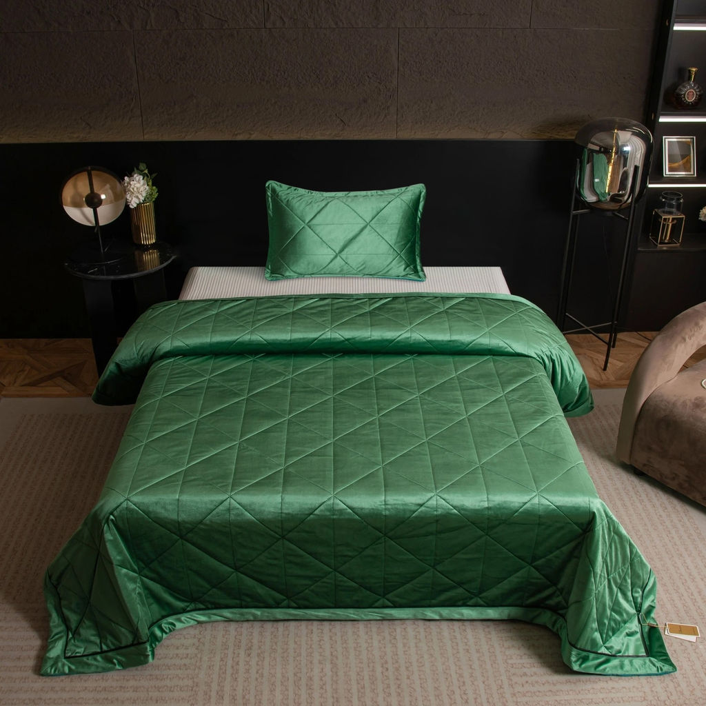 Велюровое покрывало - прекрасное дополнение интерьера спальни или гостиной, которое внесёт в пространство особую энергетику домашнего уюта. Отличительной чертой покрывала является невероятно мягкая бархатистая поверхность, которая подарит Вам незабываемые тактильные ощущения. Велюровые покрывала характеризуются прочностью и устойчивостью к механическому воздействию, воздухопроницаемостью. Изящное покрывало подчеркнёт строгие и лаконичные линии предмета мебели, смягчив их и придав неповторимое очарование не только постели, но и окружающему пространству. Геометрический узор на покрывале выполнен с использованием термостежки, что придаёт изделию особую изысканность и подчёркивает элегантность интерьера. Перед использованием рекомендуется отпарить покрывало, чтобы устранить складки, которые могли образоваться во время транспортировки и хранения товара. Материал: Бархат-велюр Состав материала: 100% пэ Наполнитель: Высокосиликонизированное микроволокно Состав наполнителя: 100% пэ Упаковка: Сумка ПВХ на молнии с ручками Изображения, элементы, расположение рисунка и цвет представленного на упаковке товара могут незначительно отличаться от оригинала. Размер: 1.5 спальное Покрывало: 160*220 см Наволочка: 50*70 см 1 шт. (с запАхом) Евро Макси Покрывало: 240*260 см Наволочка: 50*70 см 2 шт. (с запАхом) -- Характеристики -- Габариты: 58 x 45 x 12 см Вес: 2,5 кг Транспортировочная упаковка: 47.000/37.000/10.000 Упаковка: ПВХ сумка Цвет: Зеленый, Сине-зелёный Ссылка на видео: https-//www.youtube.com/embed/eb6SLil51mk Состав: Ткань- 100% пэ | Наполнитель- 100% высокосиликонизированное полиэфирное волокно Яндекс Видео: https-//yadi.sk/i/R_4ef-36jYzYeg Яндекс Фото: https-//yadi.sk/d/dCHOe-RnuRTcVw Материал: Бархат-велюр Состав материала: 100% пэ Наполнитель: Высокосиликонизированное микроволокно Состав наполнителя: 100% пэ Покрывало: 160*220 см Наволочка: 50*70 см 1 шт. (с запАхом)