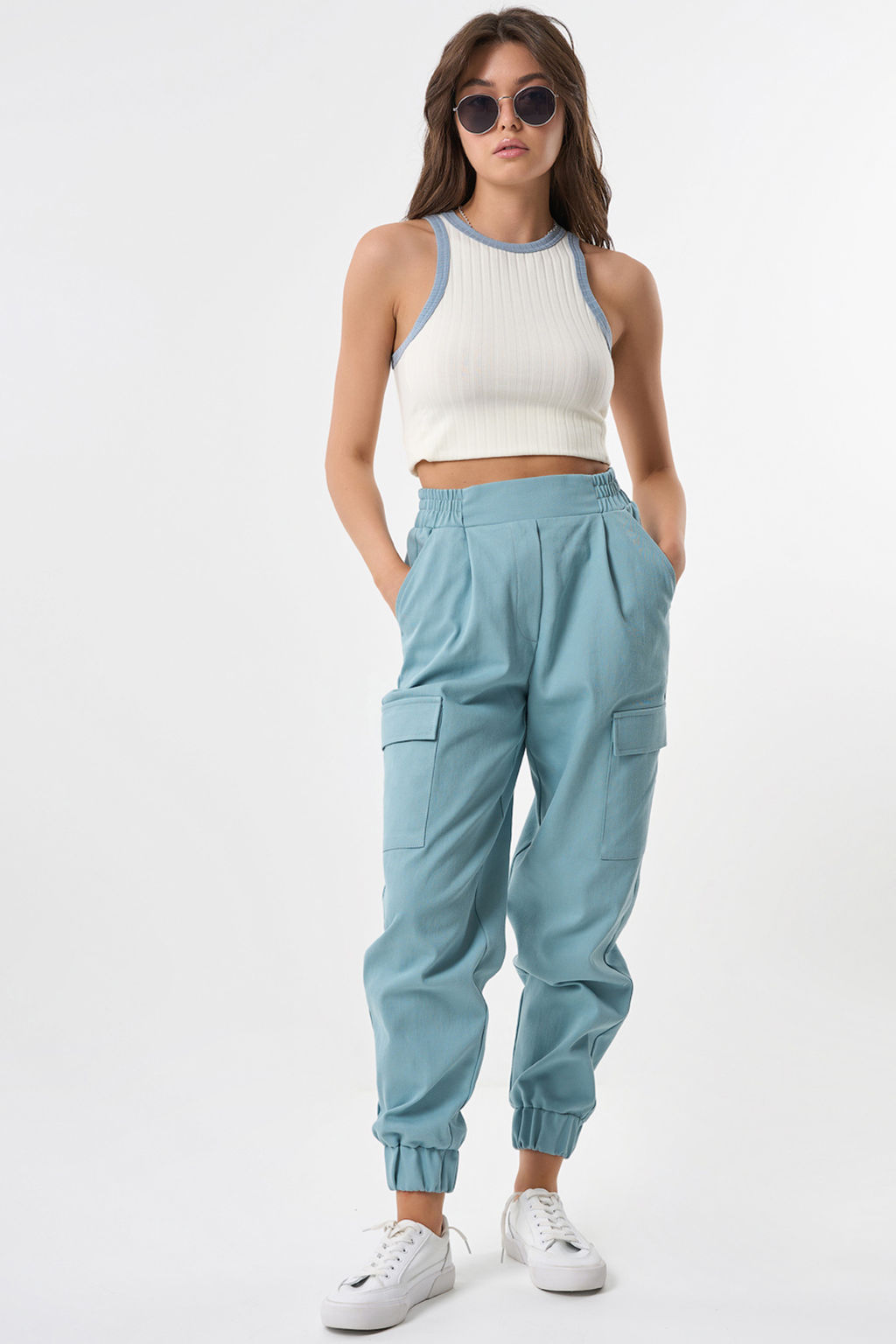 Особенности: Брюки "карго" из хлопковой ткани. Детали: притачной пояс со сборкой на резину и вставкой по переду, защипы по переду, боковые карманы, накладные карманы с клапанами по бокам, притачные манжеты со сборкой на резину. Без застежки.