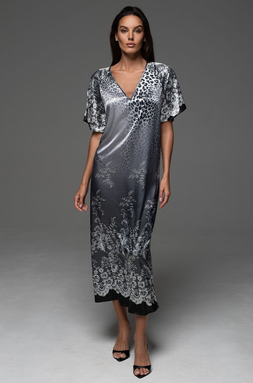 Длинная сорочка Mia-Amore с V-образным вырезом горловины и короткими рукавами выполнена из принтованного смесового шёлка с кружевным купоном по низу. Сбоку сорочки разрез. Состав:70% натуральный шелк, 25% полиэстер, 5% эластан