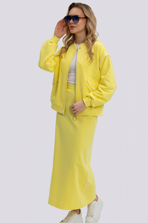 Этот костюм просто взрыв стиля! Идеальный выбор для тех, кто следит за последними трендами и не боится выделяться. Бомбер на молнии, прикрытой стильной планкой, выглядит круто и современно. Карманы, спрятанные в подрезах и украшенные декоративными клапанами, добавляют изюминку. Но главная фишка это контрастный белый кант, эффектно подчеркивающий линию плеч и проймы. Свободный крой, спущенное плечо и трикотажные манжеты на рукавах и по низу бомбера обеспечивают комфорт и расслабленный силуэт. А дальше полная свобода выбора! В комплект можно подобрать юбку или брюки, в зависимости от вашего настроения и предпочтений. Юбка А-силуэта с удобным поясом на резинке и декоративными кантами по бокам это женственно и элегантно. Отсутствие карманов делает силуэт более лаконичным. В этом костюме вы точно будете самой модной и стильной! Состав трикотажа: 75% хлопок, 20% полиэстер, 5% спандекс.­