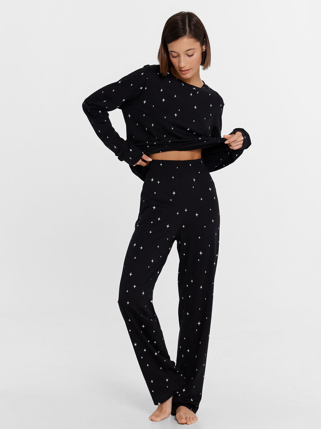 Удобная пижама женская с брюками и джемпером с длинным рукавом - лучший вариант одежды женской для дома из высококачественного материала. В составе изделия - хлопок и модал. Джемпер с круглым вырезом, длинными рукавами. Брюки прямые, с эластичной тесьмой в поясе. Размерный ряд позволит подобрать модель для любого типа фигуры. Пижама женская легкая и эластичная, имеет деликатные швы. Не линяет при стирке и не деформируется. Такая одежда дарит незабываемый комфорт и уют. Красивые, актуальные цвета порадуют представительниц прекрасного пола. Подойдет беременным девушкам для сна, отдыха и домашних дел. Порадуйте модными новинками от Mark Formelle родных и близких! -- Характеристики -- Состав: 50% модал / 50% хлопок Длина изделия по спинке, см.: 55.5 Длина изделия по боковому шву - низ, см: 103.5 Длина брючин по внутр. шву, см: 73.3 Ширина брючин - низ, см: 27.2 Фактура материала: кулирное полотно Тип рукава: длинные Тип карманов: без карманов Модель брюк: прямые Покрой: свободный Вид застежки: без застежки Декоративные элементы: без элементов Уход за вещами: деликатная стирка при 30 градусах