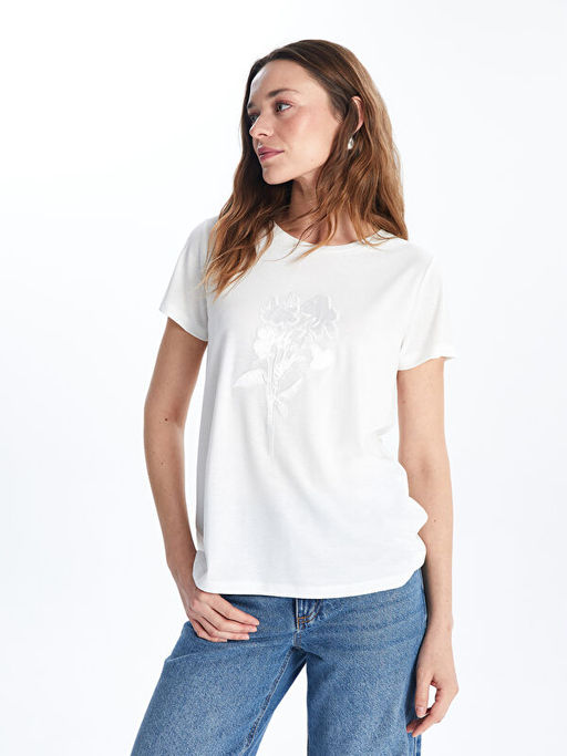 Bisiklet Yaka ?i?ekli Penye Nak??l? Kad?n Ti??rt