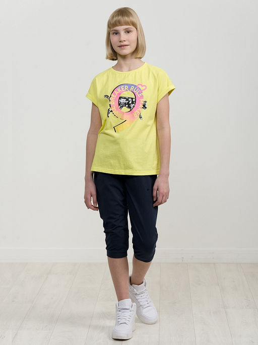 Комплект для девочек футболка и бриджи. Футболка актуального оверсайз силуэта. Спущенная линия плеча, отворот манжета из основной ткани. Стойкий эластичный принт в стиле граффити. Перевод. Тот, кто создает правила. Тот, кто нарушает правила. Бриджи расслабленной формы с дополнительной регулировкой объема шнуром и манжетами из основной ткани.